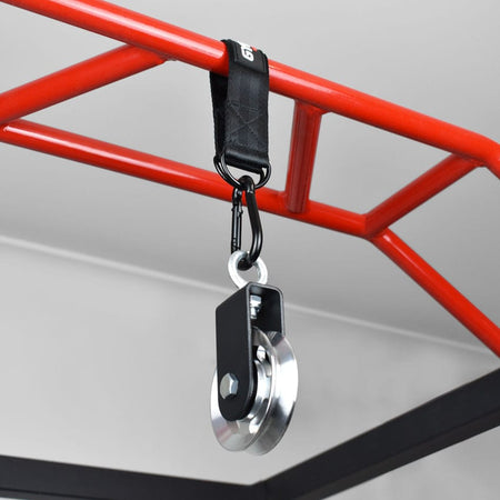 Wrap the Hanging Strap around a durable, high frame. Connect the Pulley to the Hanging Strap with a Carabiner.