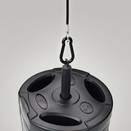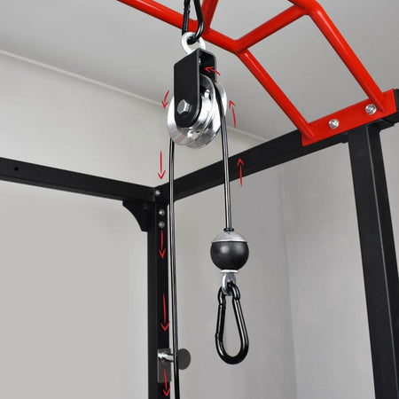 Feed the Cable end without stopper through the Pulley and connect it to the Base with a Carabiner. Attach your desired Cable Attachment to the other end.